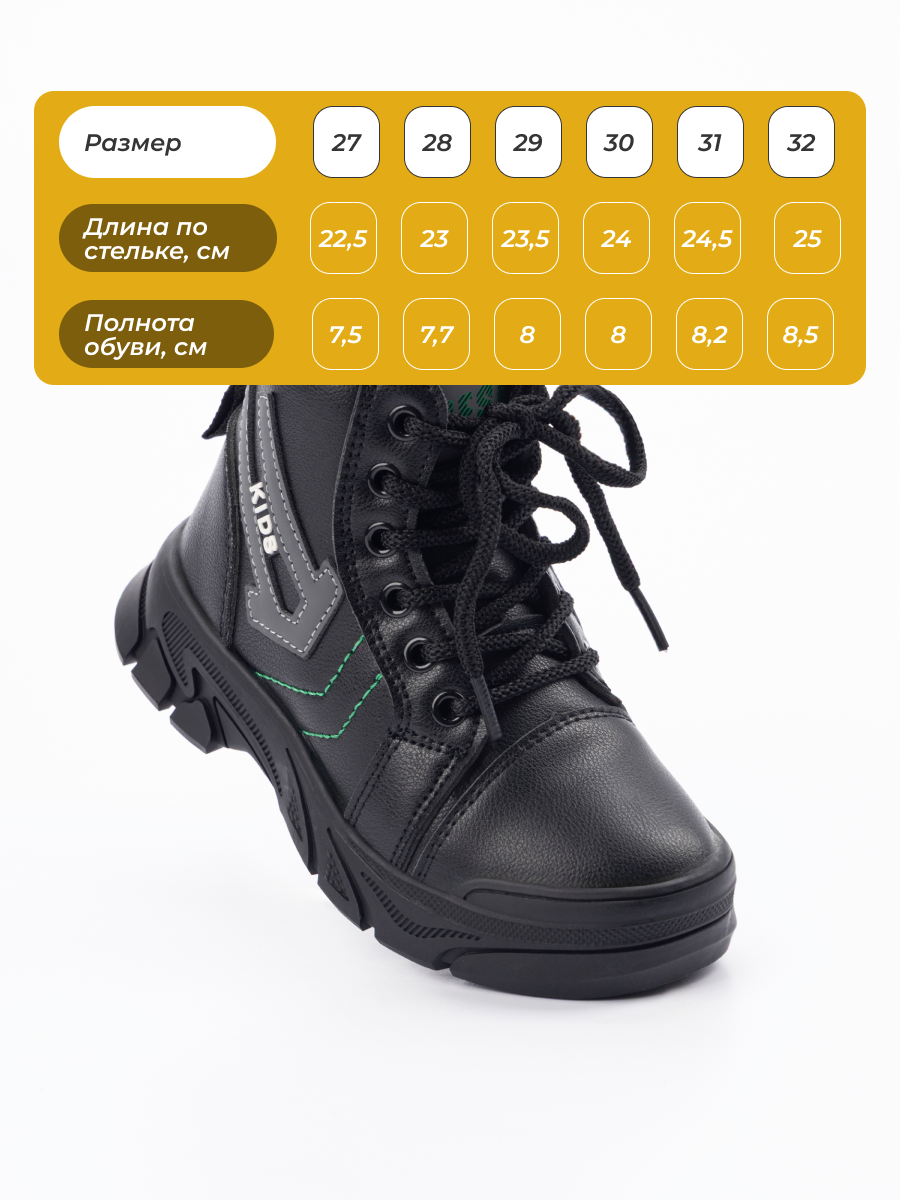 Теплые и стильные ботинки демисезонные для мальчика из качественной экокожи идеально подойдут для ребенка в школьном возрасте. Эта обувь для мальчика создана специально для демисезонного периода, обеспечивая комфорт даже в прохладную погоду. Высокий силуэт модели надежно защищает ноги, а платформа придает дополнительную устойчивость на любой поверхности. Шнурки позволяют легко зафиксировать ботинки осенние для мальчика, обеспечивая удобство при надевании и надежную посадку. Кожаная отделка подчеркивает красивый внешний вид изделия, делая детские демисезонные ботинки модным выбором для мальчиков. Подошва отличается прочностью, что важно для активных прогулок в течение всего дня. Эти ботинки школьные для мальчика сочетают в себе практичность и современный дизайн, подходящий как для повседневного использования, так и для школьных будней. Теплый внутренний слой поддерживает оптимальную температуру ног ребенка, предотвращая переохлаждение. Высокие детские ботинки обеспечивают дополнительную защиту от ветра и влаги. Ботинки на платформе прекрасно сочетаются с разными элементами гардероба благодаря своему универсальному стилю. Обувь детская для мальчика станет отличным выбором для тех, кто ценит качество, комфорт и модные тенденции одновременно. Благодаря продуманной конструкции и использованию качественных материалов эти детские осенние ботинки станут надежным спутником вашего ребенка в осенний и весенний сезоны.
