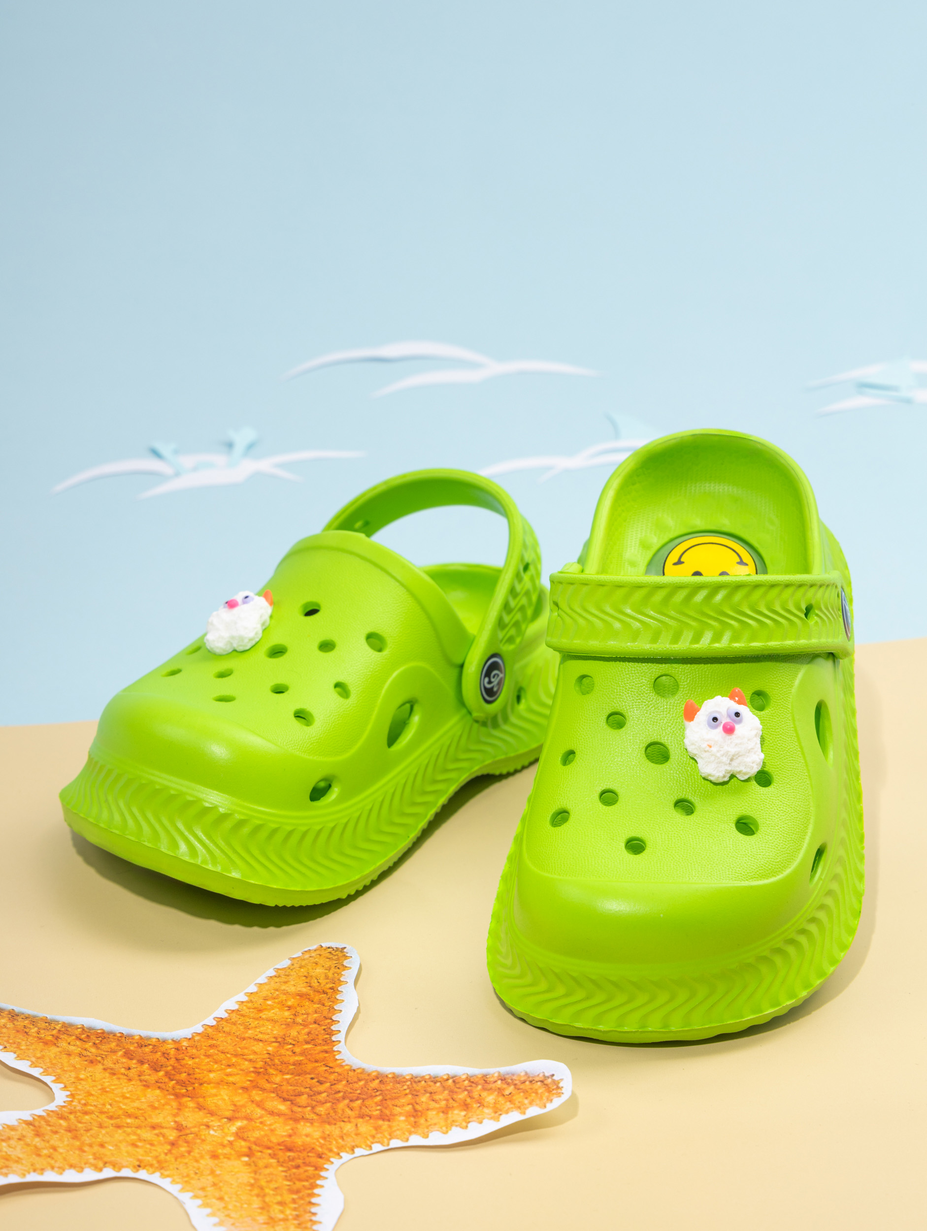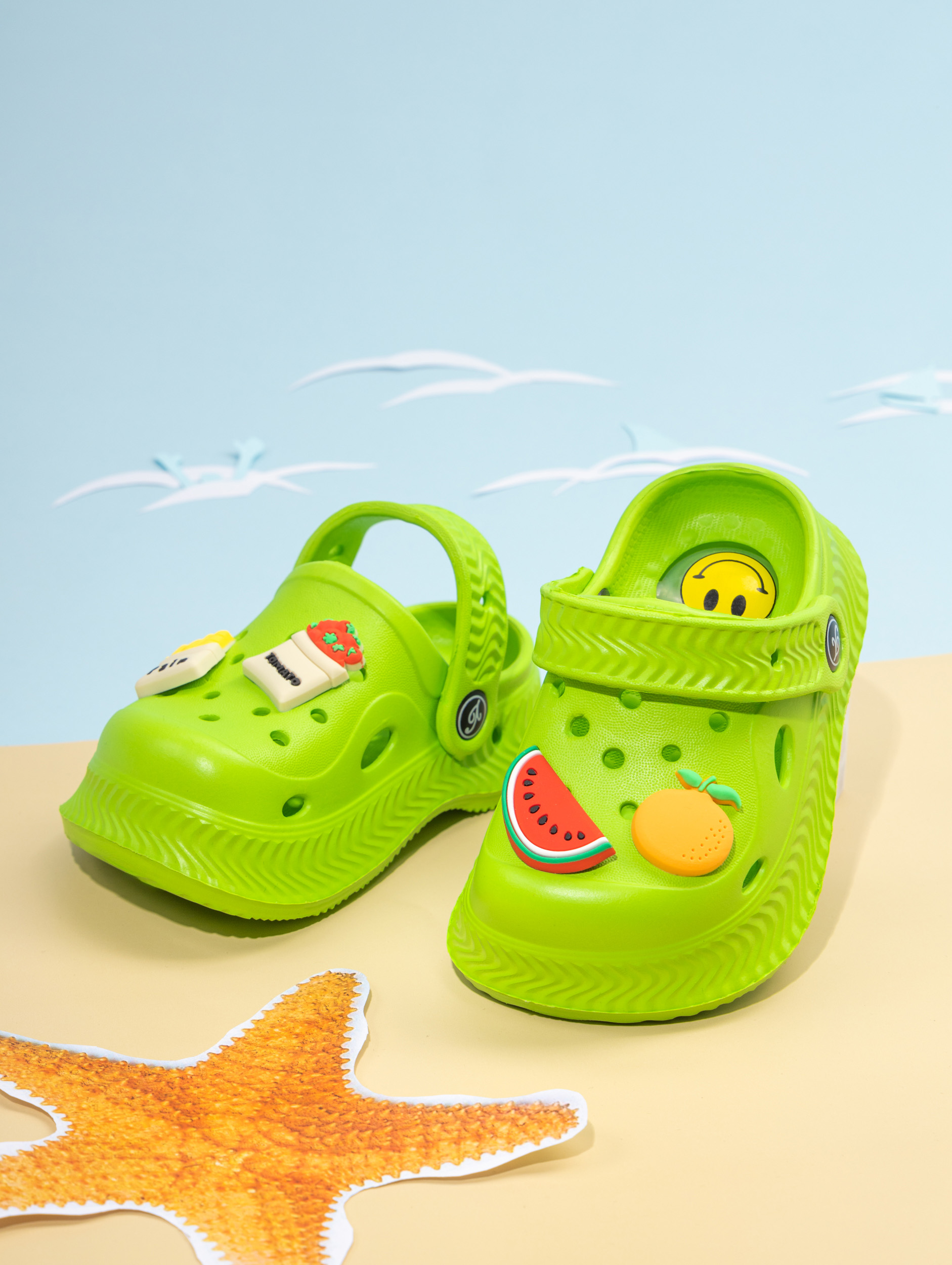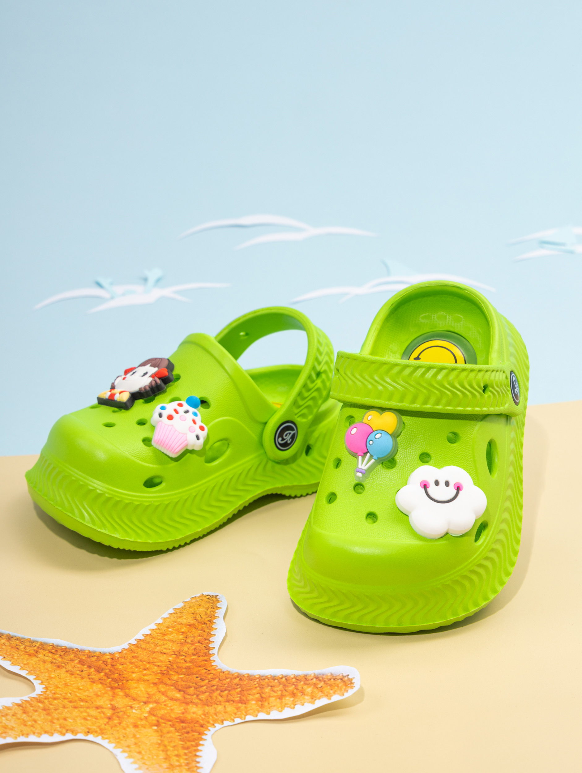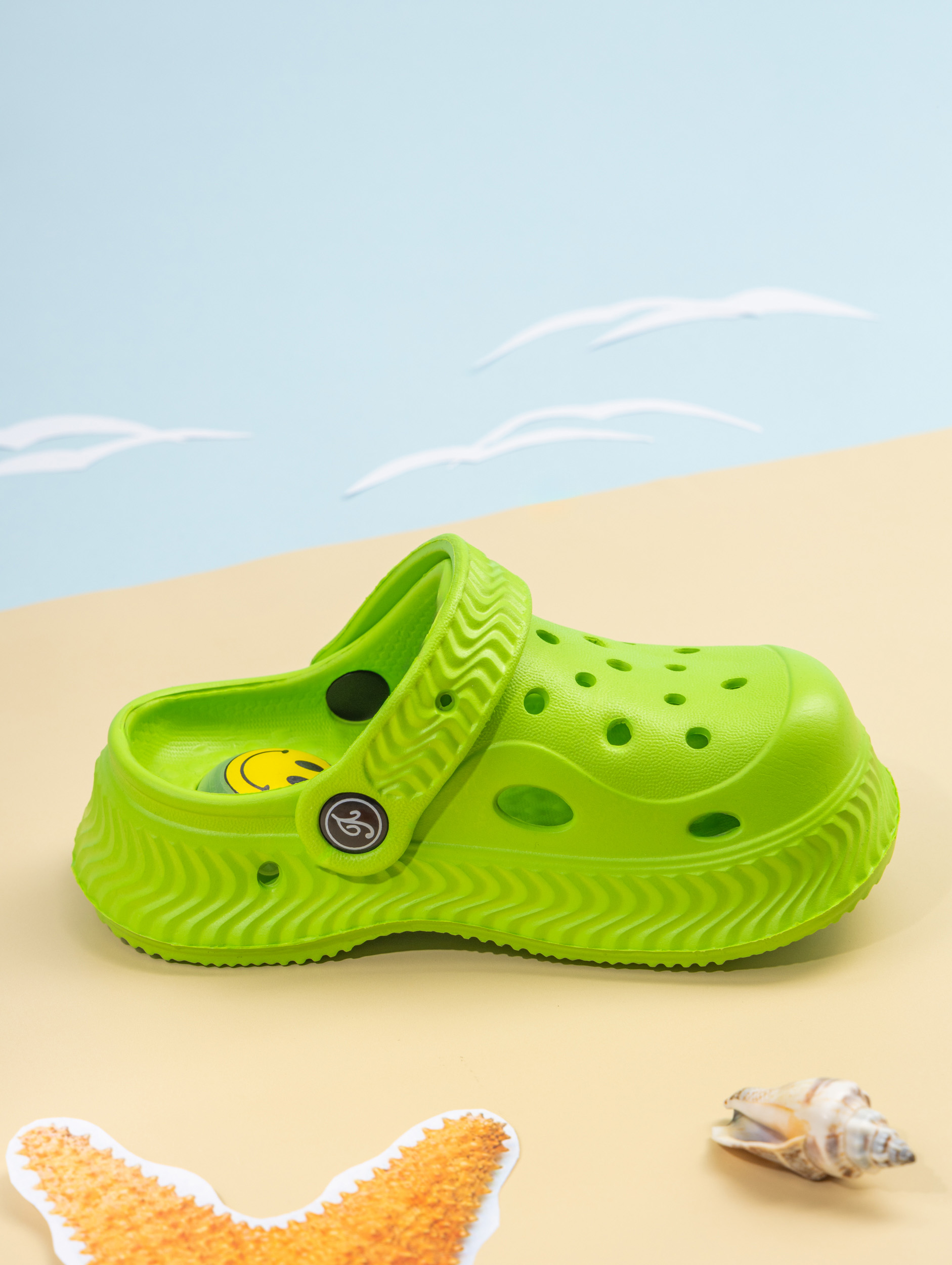 Летние детские сабо из легкого и непромокаемого материала станут идеальной обувью для активного малыша. Детские сланцы выполнены из качественного материала EVA, что делает их чрезвычайно удобными, мягкими и подходящими для повседневной носки. Благодаря наличию ремешка детские тапочки эва надежно фиксируется на ножке ребенка, обеспечивая комфорт даже во время длительных прогулок или игр. Сабо для девочки отлично подходят для сада, пляжа, бассейна или купания в море. Легкость материала позволяет малышам чувствовать себя свободно и активно двигаться, а высокое качество подошвы обеспечивает устойчивость даже на влажных поверхностях. Сабо для мальчика оснащены декоративными джиббитсами, которые добавляют яркий акцент и делают их особенно привлекательными для детей. Подошва с пищалкой будет радовать ребенка делать шаг за шагом. Детские шлепки созданы с учетом потребностей маленьких детей: резиновые тапки детские практичны, легко моются и быстро высыхают после контакта с водой. Благодаря непромокаемым свойствам материал не впитывает влагу, что идеально подходит для летних дней или посещения водных мест. Детские тапки EVA имеют стильный внешний вид и подойдут как для ежедневного использования в садике или дома, так и для отдыха на природе. Универсальный дизайн позволяет использовать сабо для малышей как пляжную обувь или сменные тапки. Подошва обладает высокой износостойкостью и устойчива к скольжению. Такие шлепанцы для малышей станут прекрасным выбором как для прогулок в саду, так и для занятий у воды. Сланцы для мальчиков имеют современный дизайн с возможностью менять джиббитсы по настроению ребенка. Резиновая структура изделия подходит даже самым маленьким детям благодаря своей гибкости и мягкости при ходьбе. Сланцы для девочки остаются комфортными при любой активности ребенка — будь то отдых у моря или игры во дворе дома. Эти тапочки для малышей создаст удобство малышу в любых условиях: от жарких солнечных дней до времени купания в бассейне.