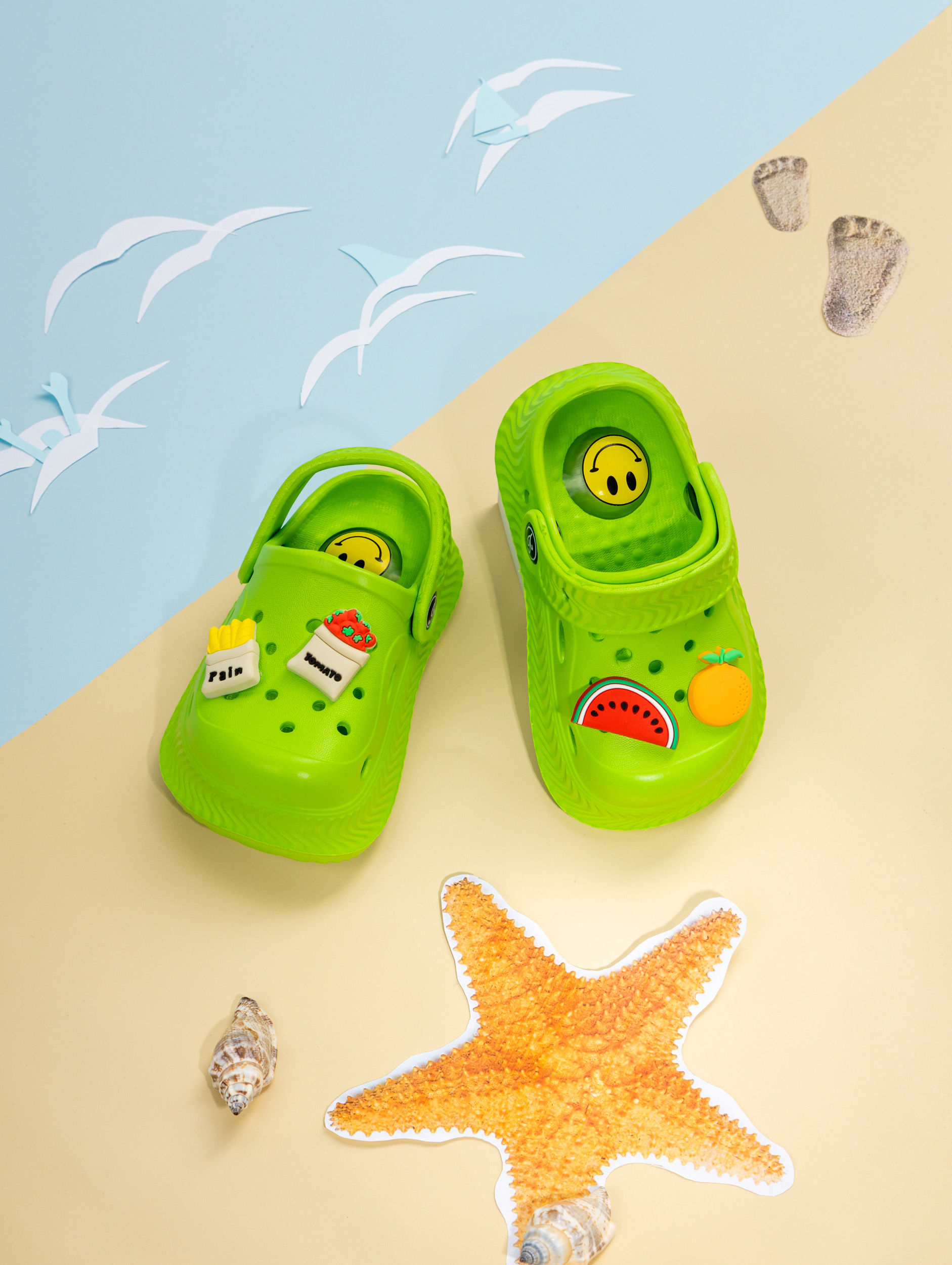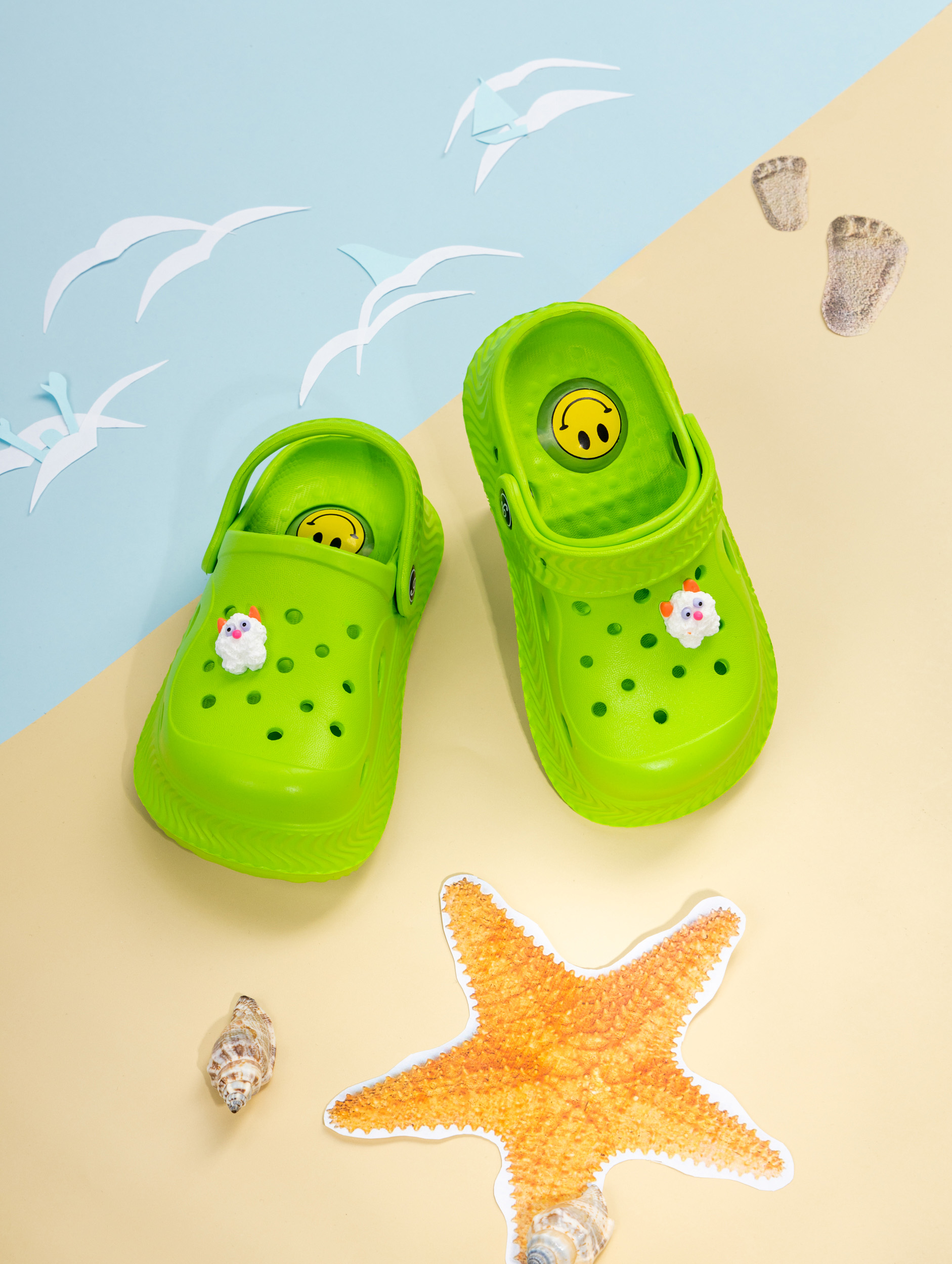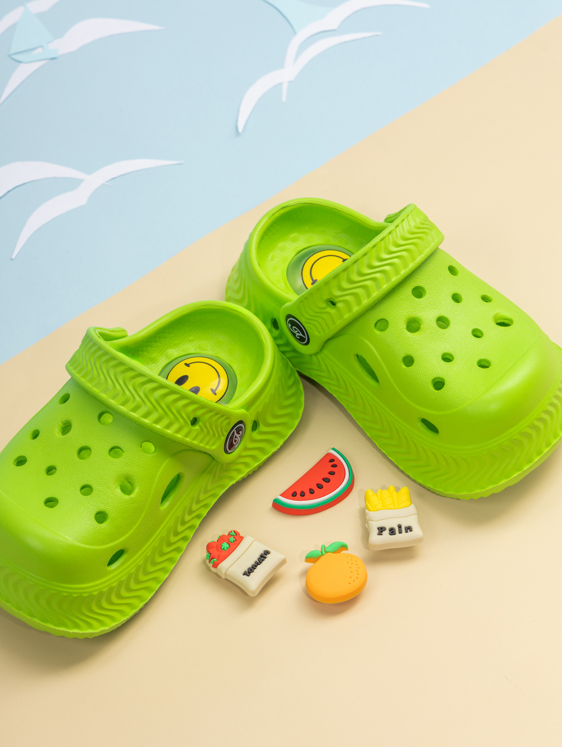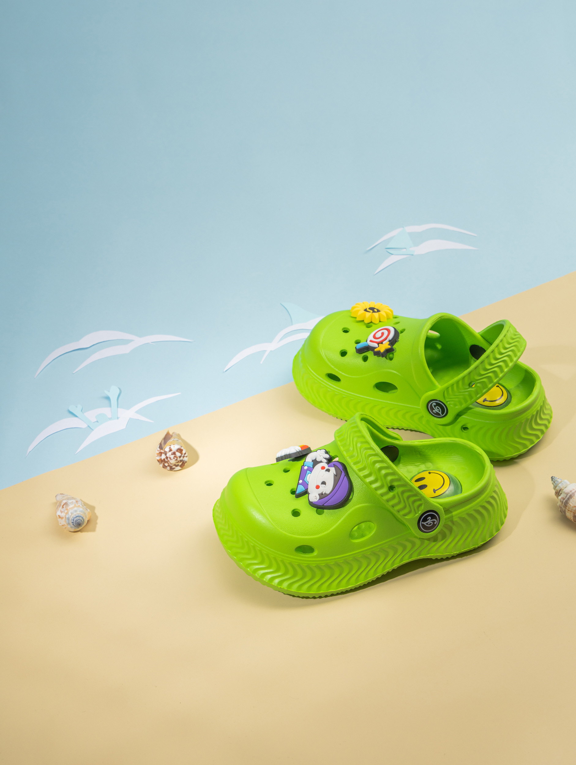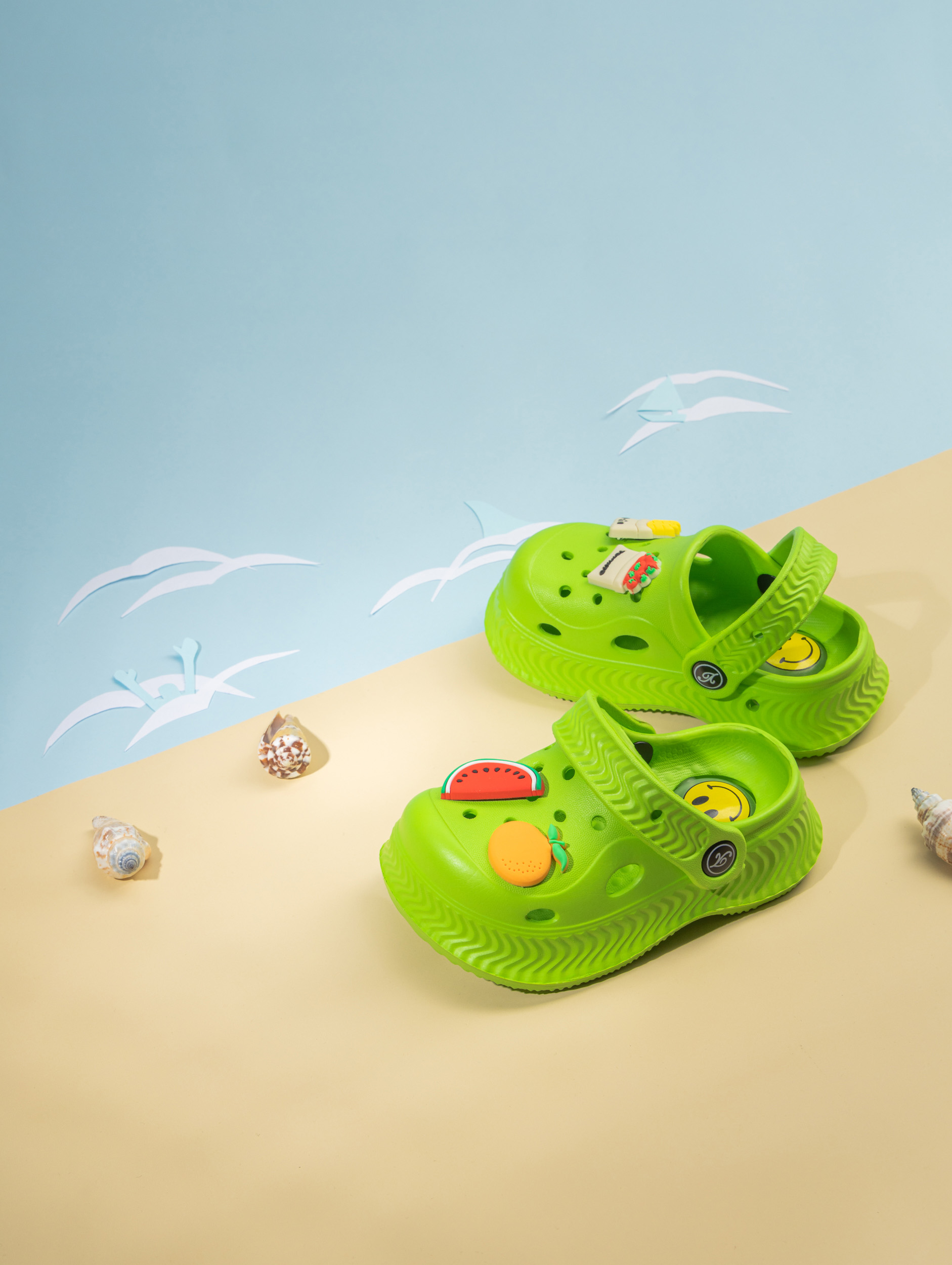 Летние детские сабо из легкого и непромокаемого материала станут идеальной обувью для активного малыша. Детские сланцы выполнены из качественного материала EVA, что делает их чрезвычайно удобными, мягкими и подходящими для повседневной носки. Благодаря наличию ремешка детские тапочки эва надежно фиксируется на ножке ребенка, обеспечивая комфорт даже во время длительных прогулок или игр. Сабо для девочки отлично подходят для сада, пляжа, бассейна или купания в море. Легкость материала позволяет малышам чувствовать себя свободно и активно двигаться, а высокое качество подошвы обеспечивает устойчивость даже на влажных поверхностях. Сабо для мальчика оснащены декоративными джиббитсами, которые добавляют яркий акцент и делают их особенно привлекательными для детей. Подошва с пищалкой будет радовать ребенка делать шаг за шагом. Детские шлепки созданы с учетом потребностей маленьких детей: резиновые тапки детские практичны, легко моются и быстро высыхают после контакта с водой. Благодаря непромокаемым свойствам материал не впитывает влагу, что идеально подходит для летних дней или посещения водных мест. Детские тапки EVA имеют стильный внешний вид и подойдут как для ежедневного использования в садике или дома, так и для отдыха на природе. Универсальный дизайн позволяет использовать сабо для малышей как пляжную обувь или сменные тапки. Подошва обладает высокой износостойкостью и устойчива к скольжению. Такие шлепанцы для малышей станут прекрасным выбором как для прогулок в саду, так и для занятий у воды. Сланцы для мальчиков имеют современный дизайн с возможностью менять джиббитсы по настроению ребенка. Резиновая структура изделия подходит даже самым маленьким детям благодаря своей гибкости и мягкости при ходьбе. Сланцы для девочки остаются комфортными при любой активности ребенка — будь то отдых у моря или игры во дворе дома. Эти тапочки для малышей создаст удобство малышу в любых условиях: от жарких солнечных дней до времени купания в бассейне.