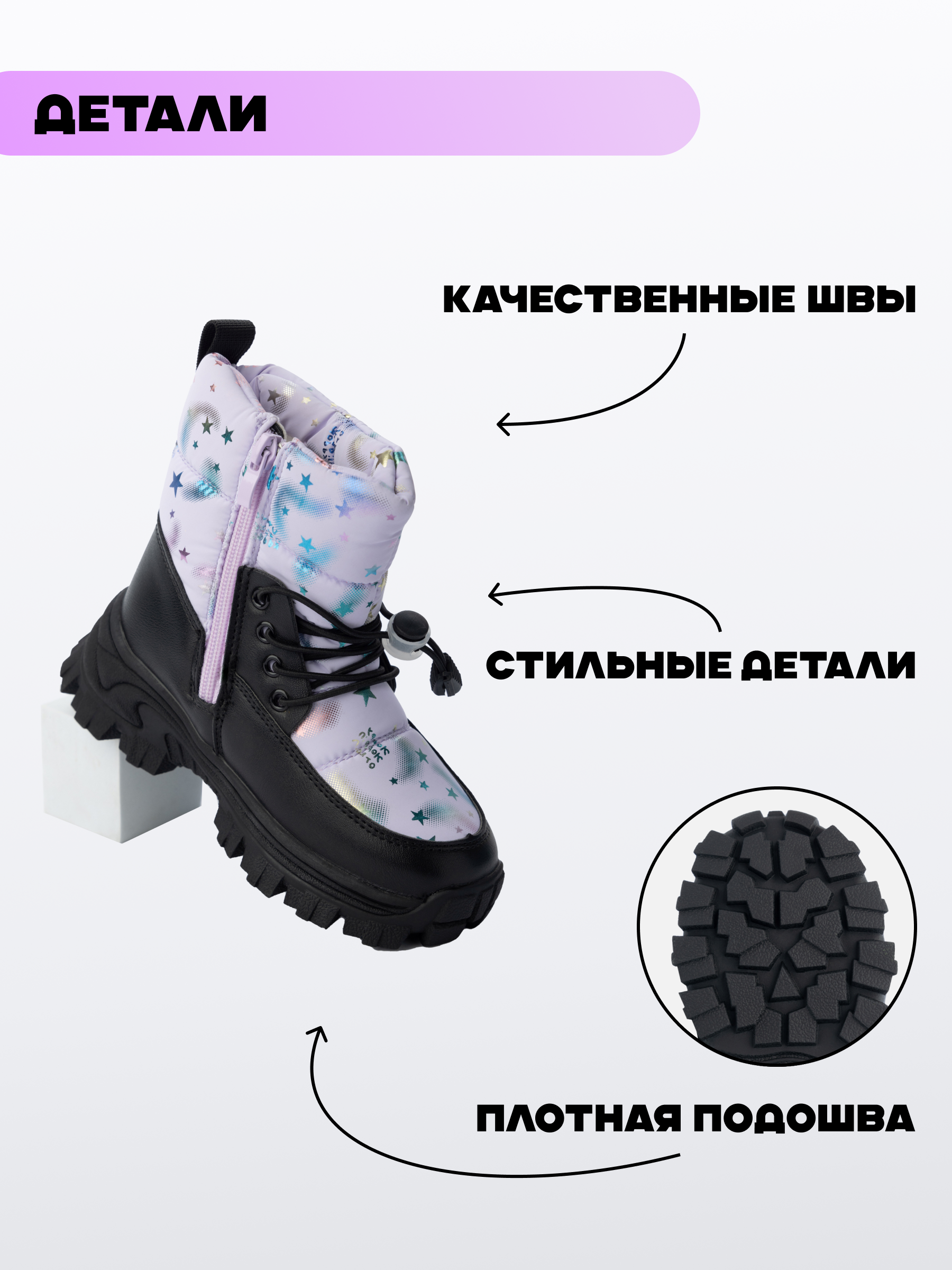 Дутики зимние для девочки – идеальная обувь для холодного времени года. Эти дутики на девочку созданы специально для девочек подростков, которым важно сочетание стиля и комфорта. Дутики детские отлично подойдут как для повседневной носки, так и для посещения школы в зимние дни. Дети смогут насладиться каждой прогулкой благодаря теплой и защитной структуре обуви. Зимние сапожки для девочки выполнены с учетом всех потребностей ребенка. Подкладка из искусственного меха обеспечивает дополнительные тепло и уют в морозные дни. Декоративные элементы делают теплые ботинки модным решением для юных модниц. Высокая платформа и резиновая подошва подарят уверенность на скользких поверхностях, обеспечивая хорошее сцепление. Прорезиненные участки защищают полуботинки для девочки от влаги, сохраняя ноги сухими даже во время мокрого снега. Дутый стеганый верх добавляет легкость походке, а стильный дизайн привлекает внимание окружающих. Спортивные детали гармонично сочетаются с любой школьной одеждой, превращая полусапожки для девочки в универсальную составляющую гардероба каждого школьника. Зимние детские ботинки оснащены удобной молнией: ребенку легко снять или надеть обувь без лишних усилий. Зимние дутики имеют молнию, упрощающую надевание и снятие обуви. Шнурки позволяют регулировать посадку по ноге, добавляя комфорт при долгой ходьбе или активных играх на улице. Защитная конструкция предотвращает переохлаждение стопы, а мех заботится о сохранении тепла даже при смене температуры. Эти дутики подростковые легко станут любимым предметом одежды ребенка благодаря продуманному сочетанию функциональности и эстетики.