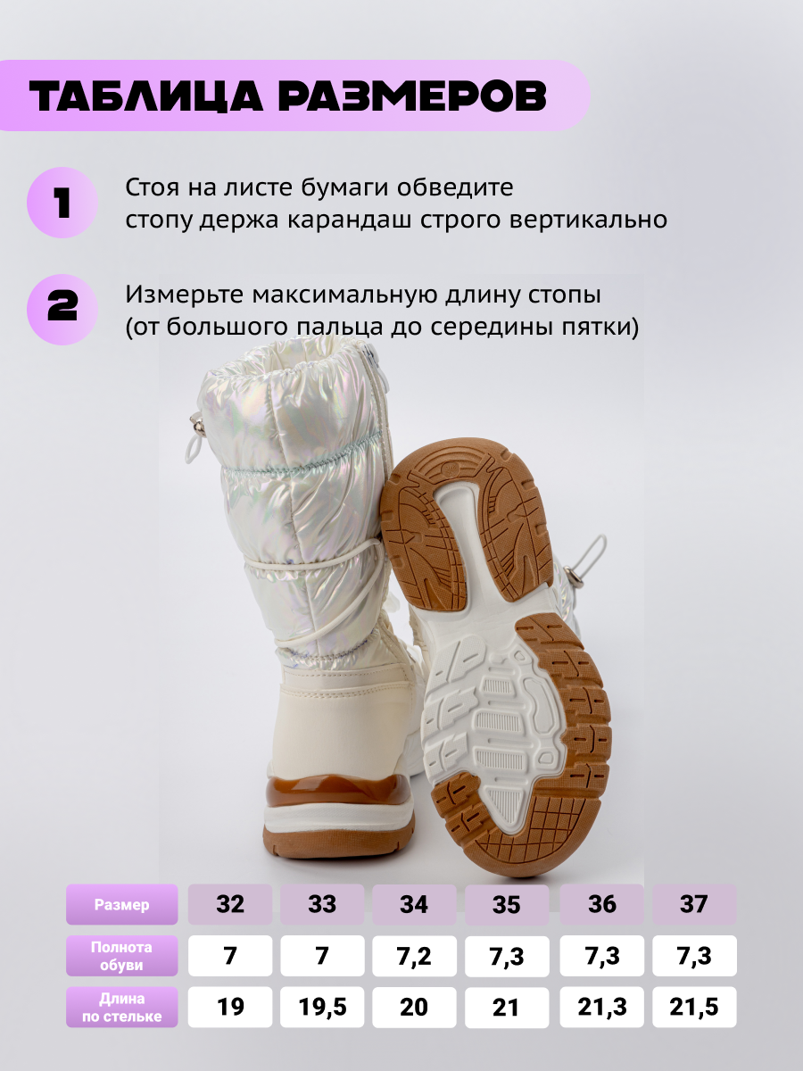 Внутренний мех зимней обуви для девочки мягко окутывает ноги, создавая дополнительный уют и защиту от мороза, а комфортная посадка гарантирует свободу движений — можно бегать, прыгать и активно проводить время. Благодаря дутой структуре, дутыши остаются легкими по весу — ноги не устают даже после долгих прогулок.