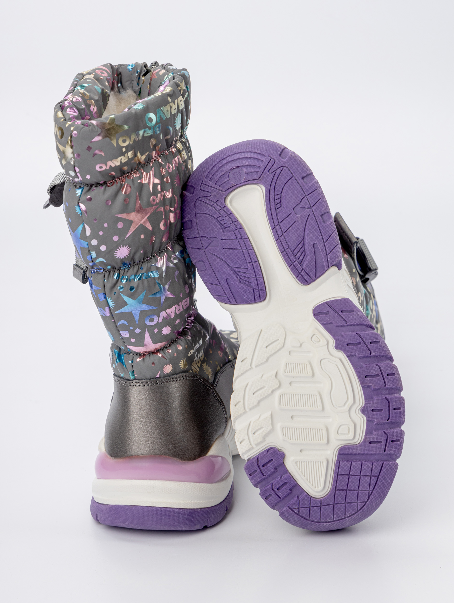 Подошва зимних дутиков обеспечивает отличное сцепление с любой поверхностью, снижая риск скольжения и повышая безопасность при активных играх на свежем воздухе. Она одновременно прочная и легкая, что позволит ногам чувствовать себя свободно и уверенно. А голенище средней высоты сохраняет дополнительное тепло и препятствует попаданию снега внутрь обуви при активных играх.