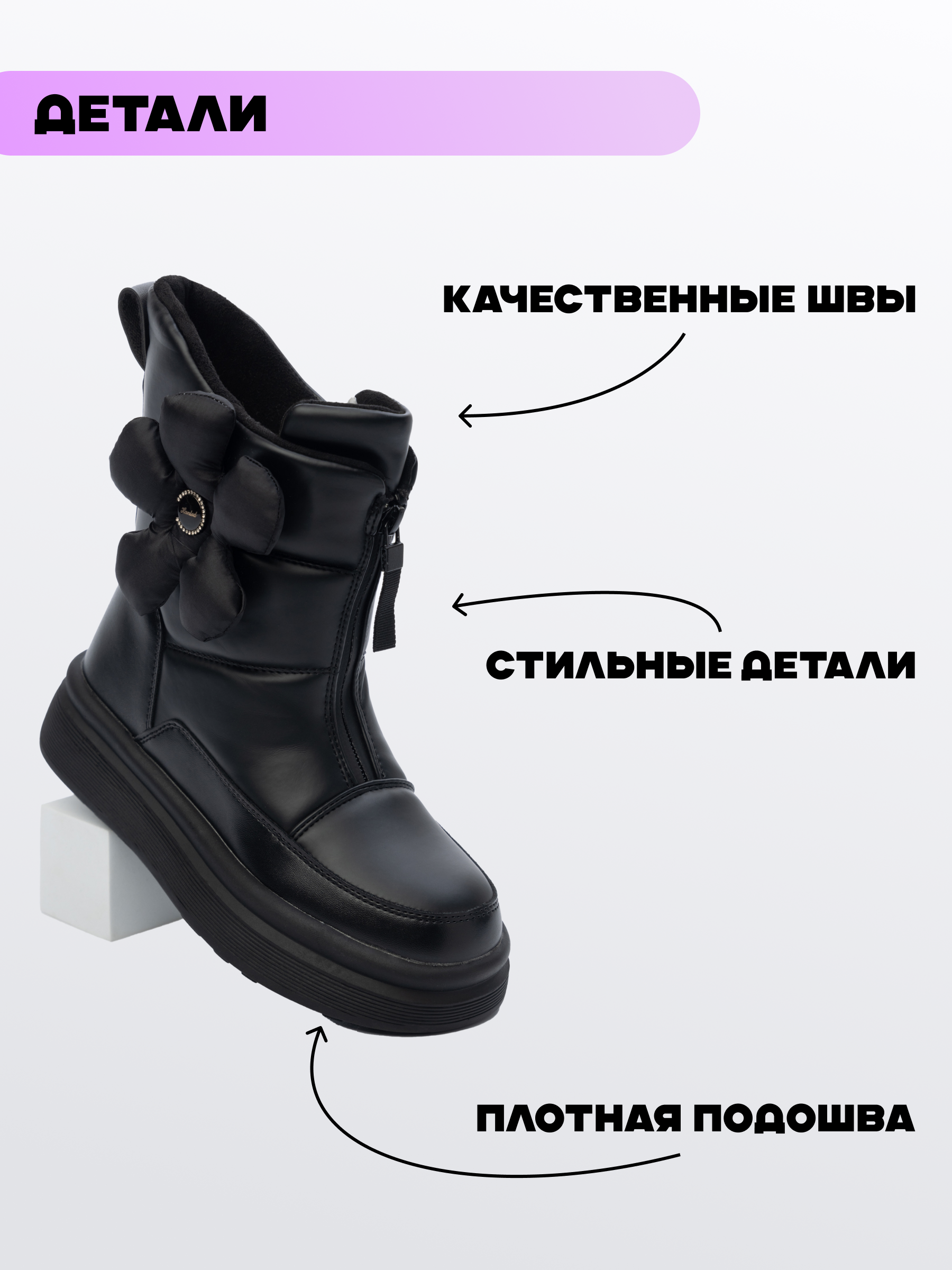 Зимние сапожки для девочки для зимы созданы специально, чтобы обеспечить девочке тепло и комфорт в холодные дни. Сапоги зимние подростковые представляют собой удачное сочетание модного дизайна и функциональности, что делает их идеальной обувью для зимнего времени. Зимние сапожки обладают высокой платформой, обеспечивающей дополнительный комфорт и защиту от холодной земли. Подошва устойчиво ведет себя на скользких поверхностях, так что подростку будет удобно передвигаться даже по обледенелым или заснеженным тротуарам. Для тех дней, когда мороз особенно силен, детские сапожки снабжены теплым внутренним слоем из искусственного меха. Полусапожки для девочки помогает сохранять ноги в тепле независимо от погодных условий. Материал верха выполнен из высококачественной искусственной кожи с водоотталкивающими свойствами, что делает зимние детские ботинки непромокаемыми при ходьбе по сугробам или под дождем. Детские зимние ботинки станут надежным спутником для школьных будней — от походов на уроки до прогулок после занятий. Дизайн включает удобную застежку молнию сбоку. Это не только облегчает надевание сапожек, но и способствует плотному прилеганию к ноге, обеспечивая дополнительное теплоизоляцию во время зимних морозов. Стильный внешний вид добавляет уверенности моднице, ведь эта пара обуви тщательно продумана с точки зрения эстетики. Высокая подошва поддерживает правильную осанку подростка и равномерно распределяет вес тела. Это особенно важно в период роста ребенка.