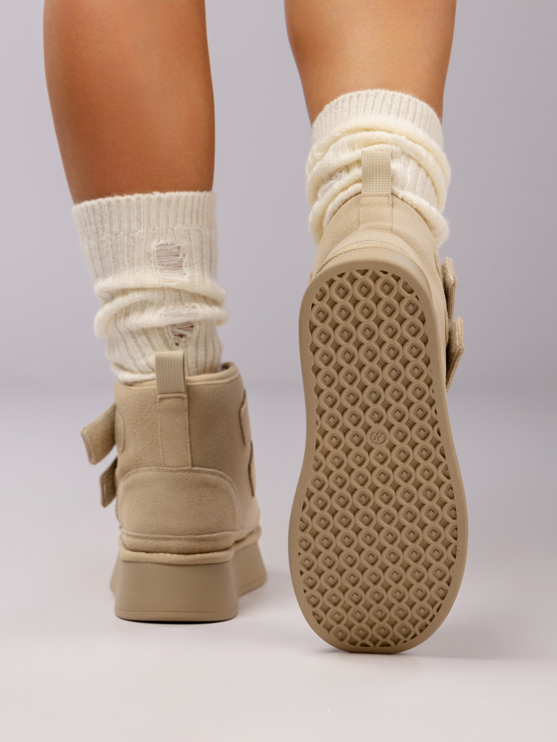 Дизайн и функциональность сочетаются в нейтральной цветовой гамме, которая легко комбинируется с разными образами. Угги с липучками идеально подходят к брюкам, джинсам и леггинсам, сохраняя стильный вид в городских условиях.