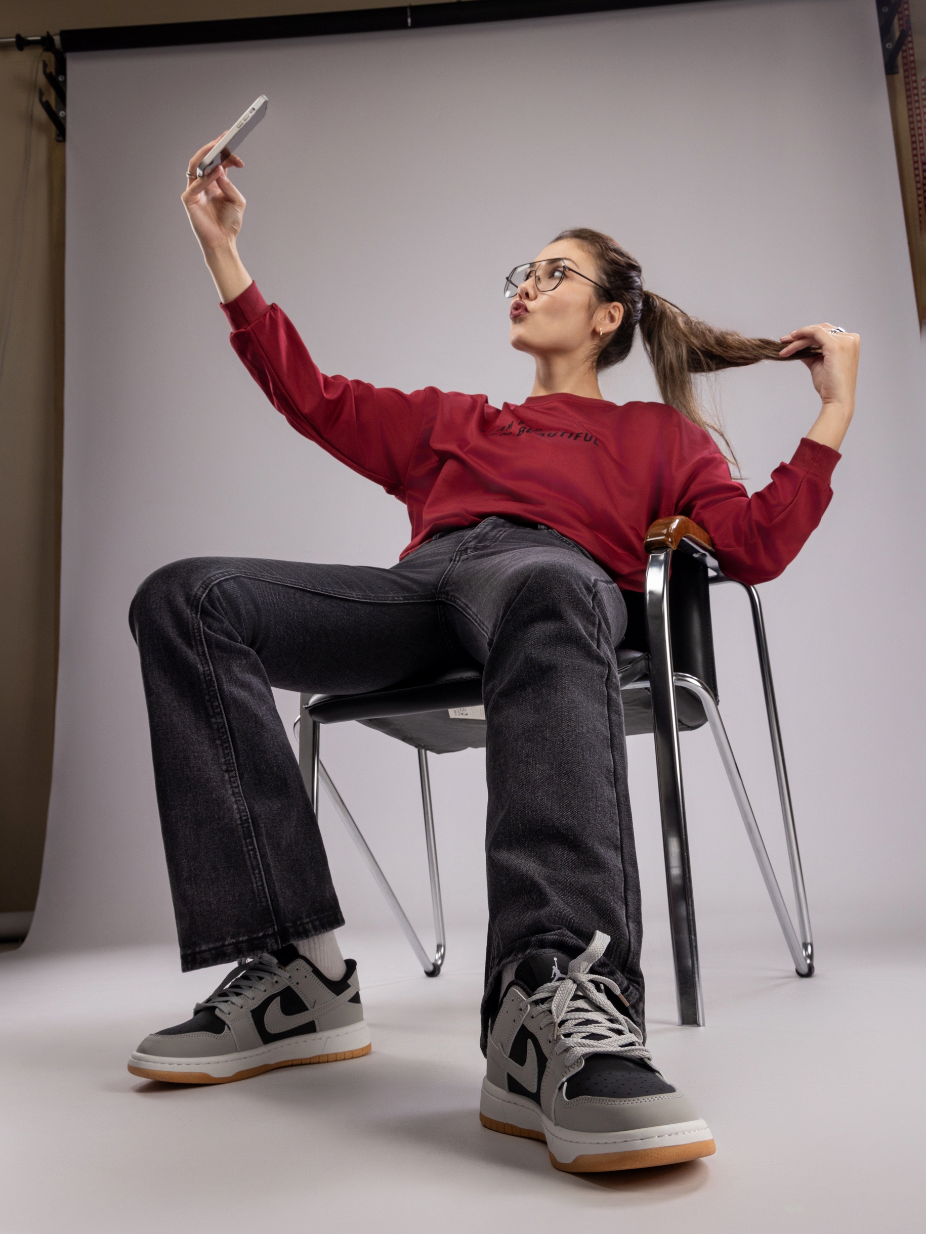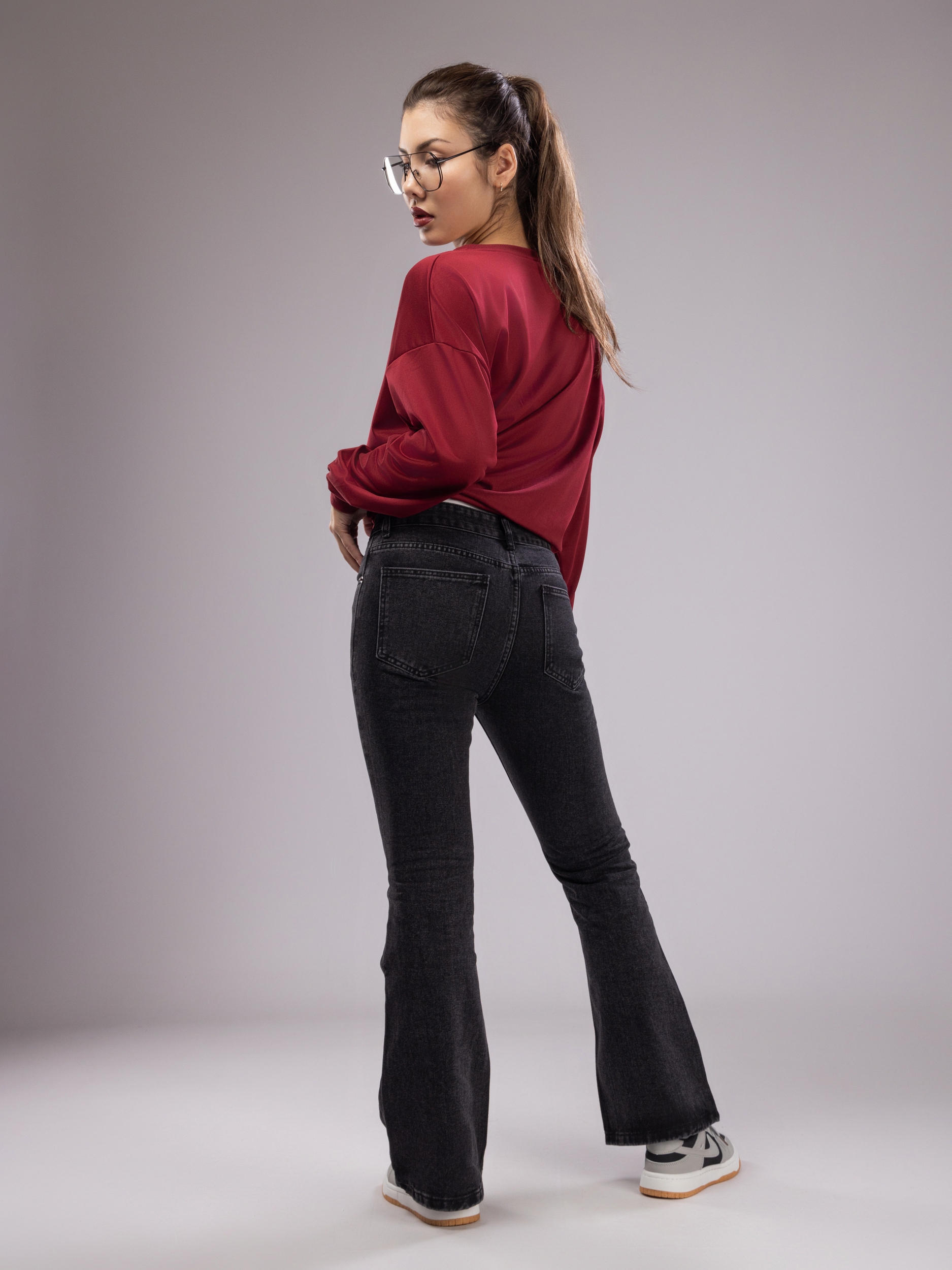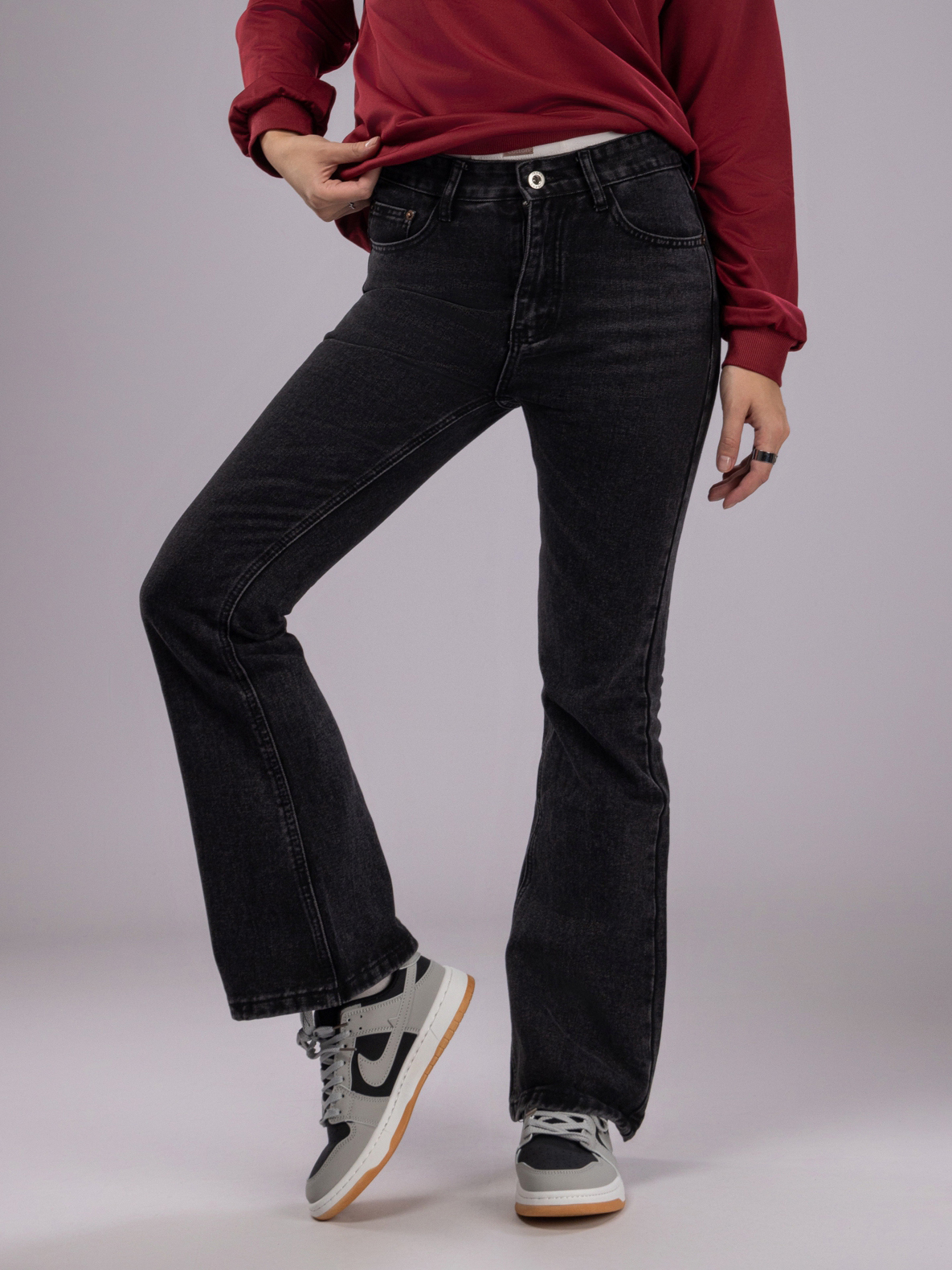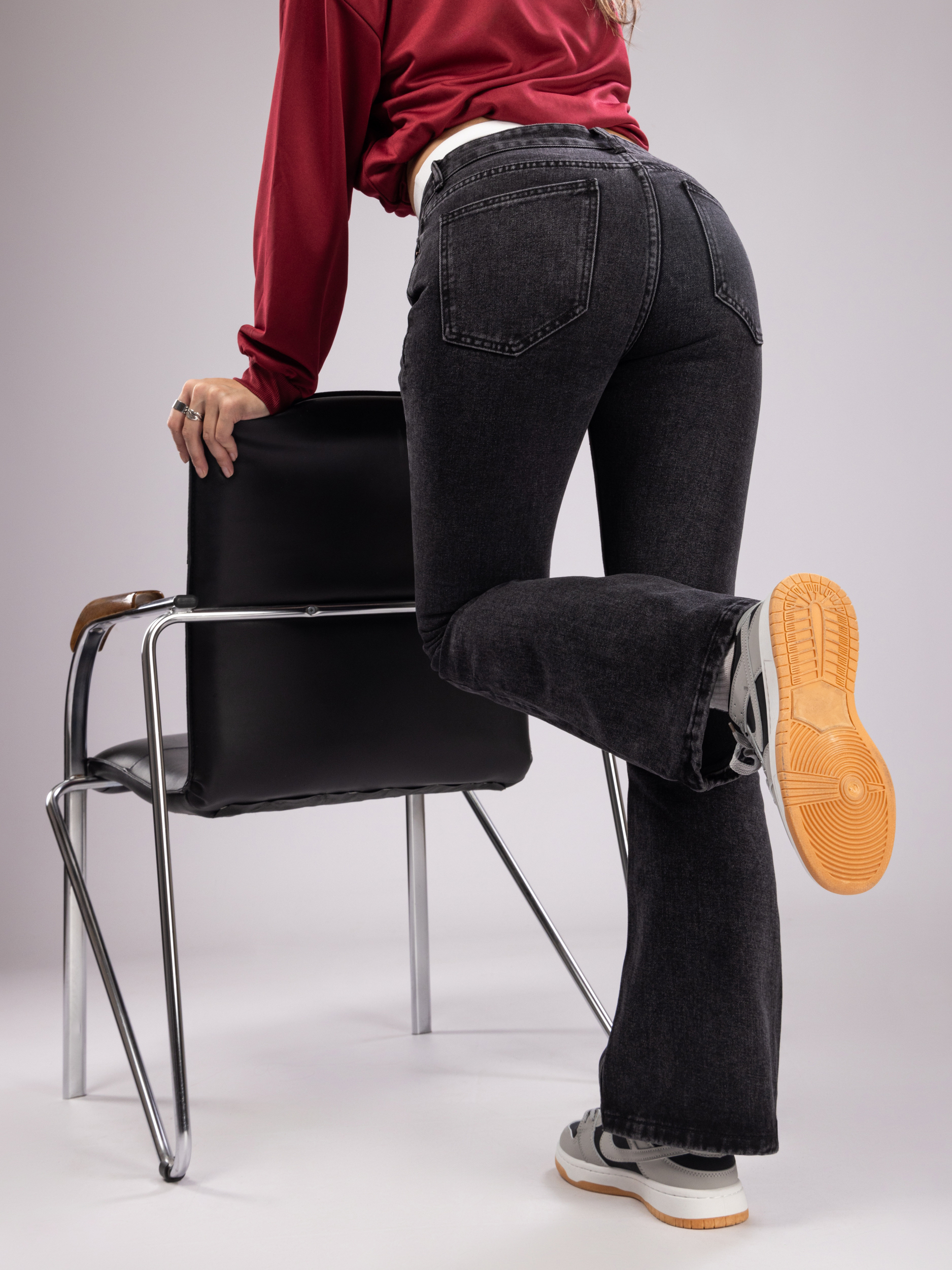 Женские брюки отличаются широкими штанинами, что не только визуально удлиняет ноги, делая силуэт более стройным и элегантным, но и добавляет образу нотки ретро-стиля с современным акцентом. Джинсы женские клеш сочетаются с разнообразной обувью — от спортивных кроссовок и сандалий до классических ботильонов и каблуков, открывая широкие возможности для воплощения как повседневных, так и стильных, более изысканных луков.