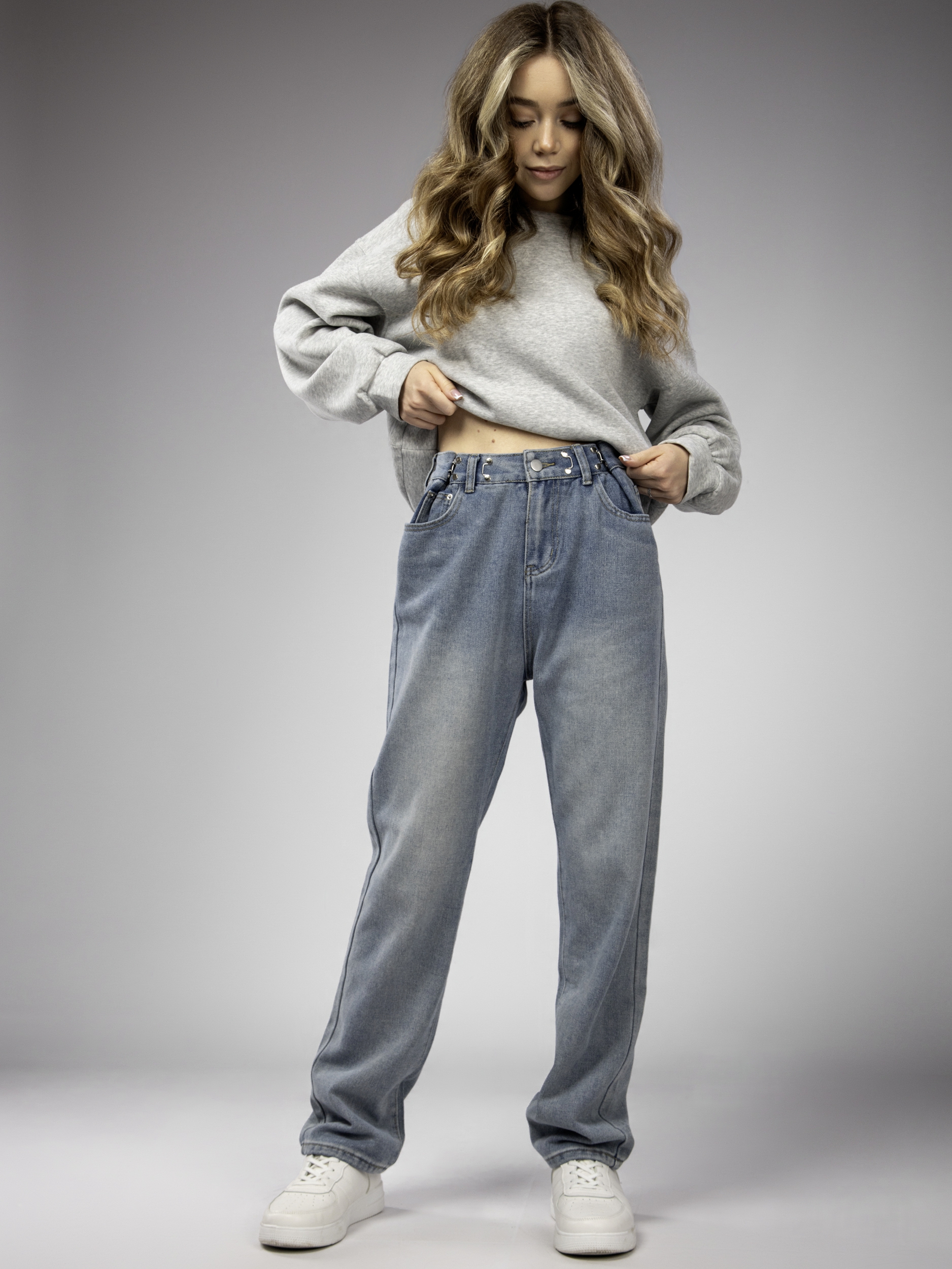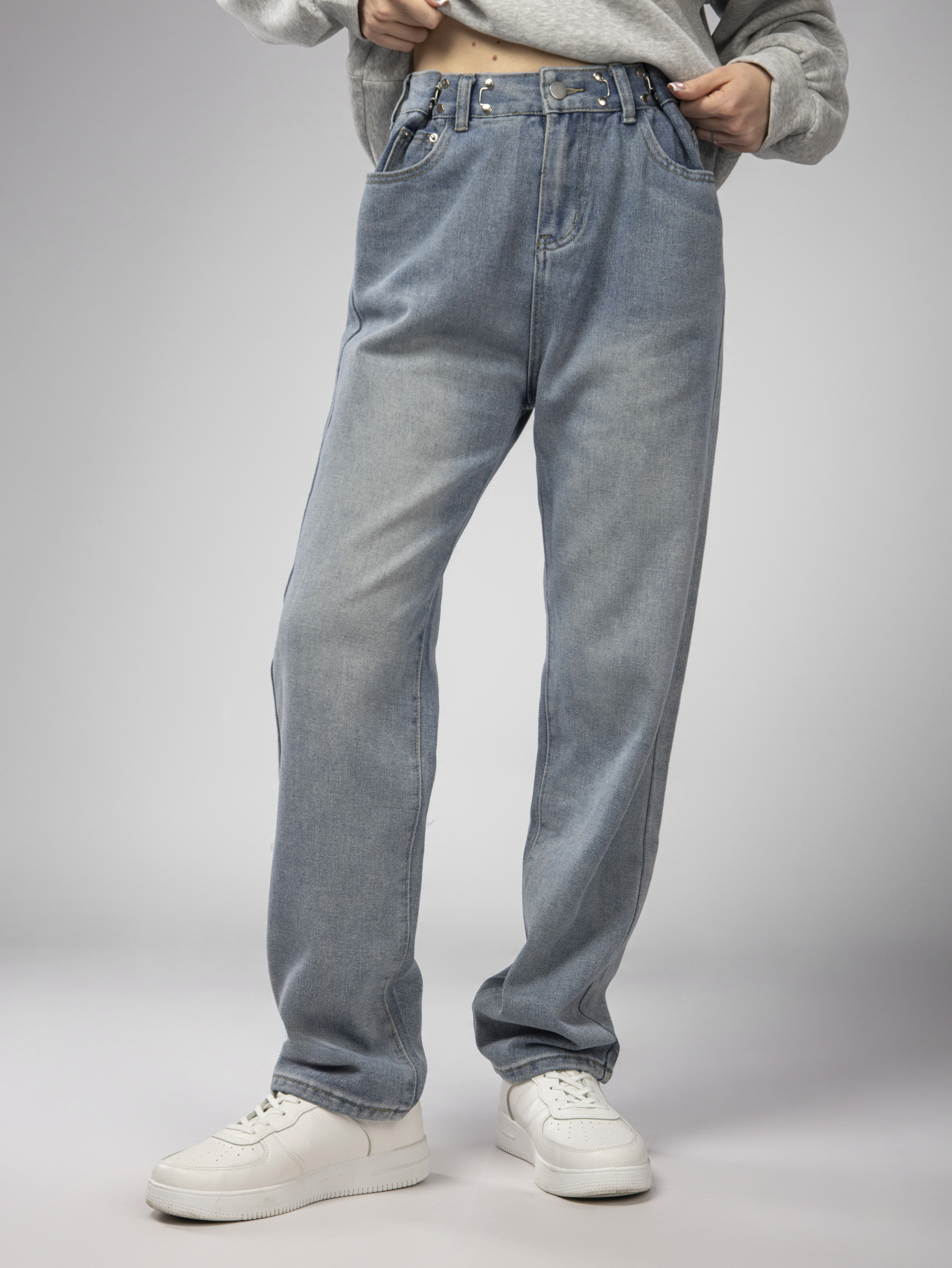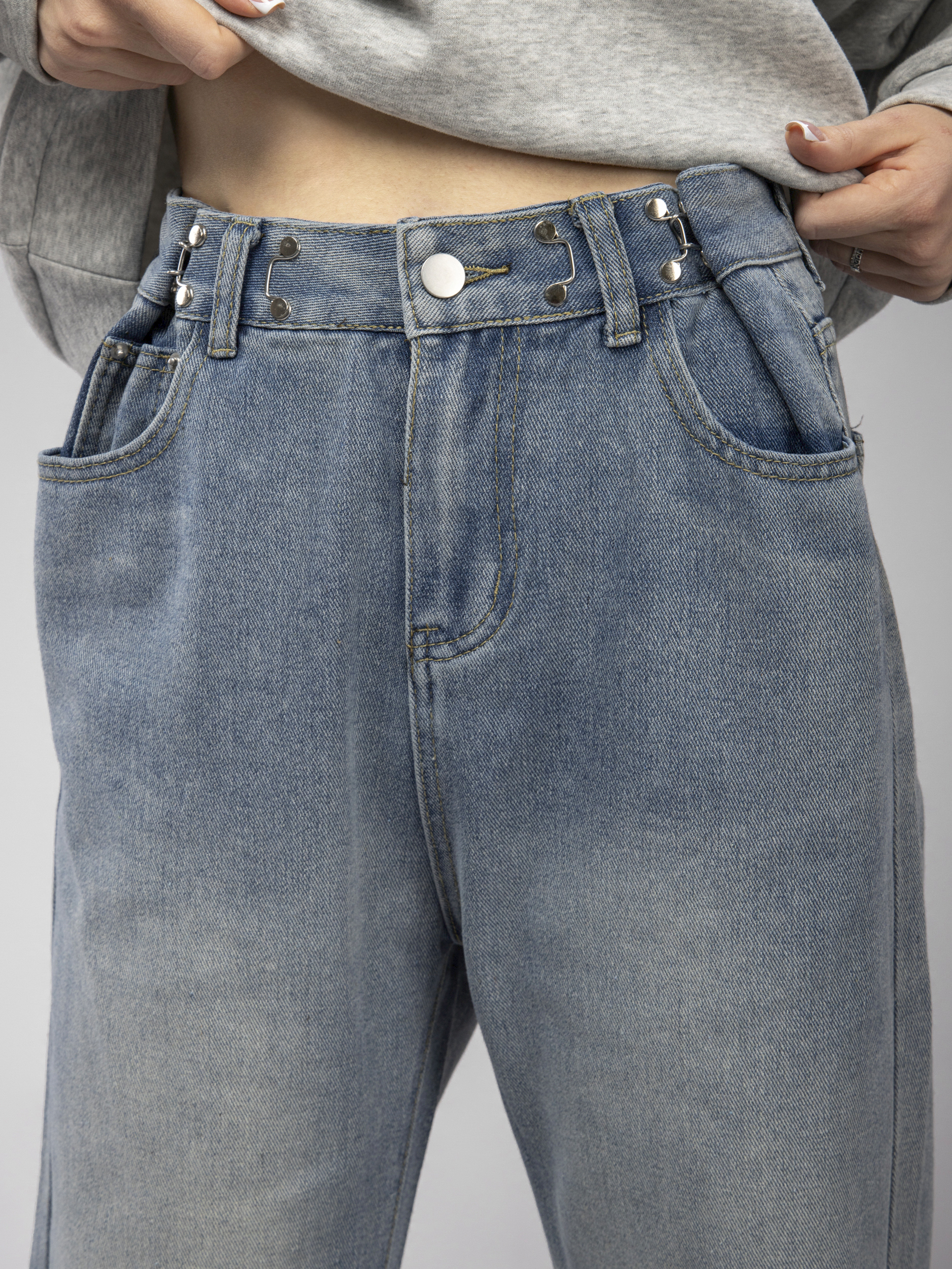Основная черта этой модели — это регулировочные зажимы на поясе, позволяющие идеально подогнать ширину и обеспечить комфортную посадку на талии. Благодаря этим элементам, джинсы для девушки можно затянуть без использования ремня.