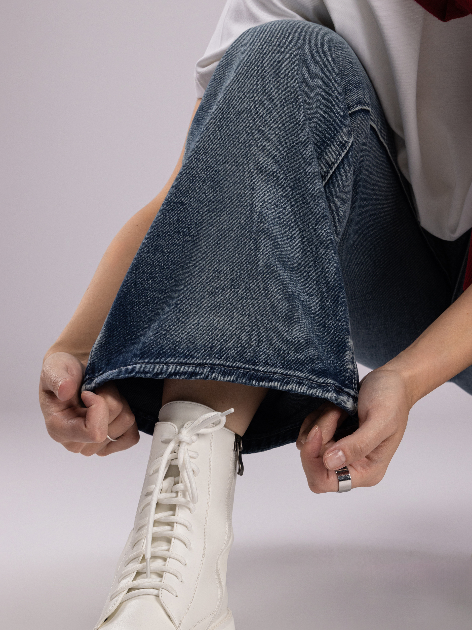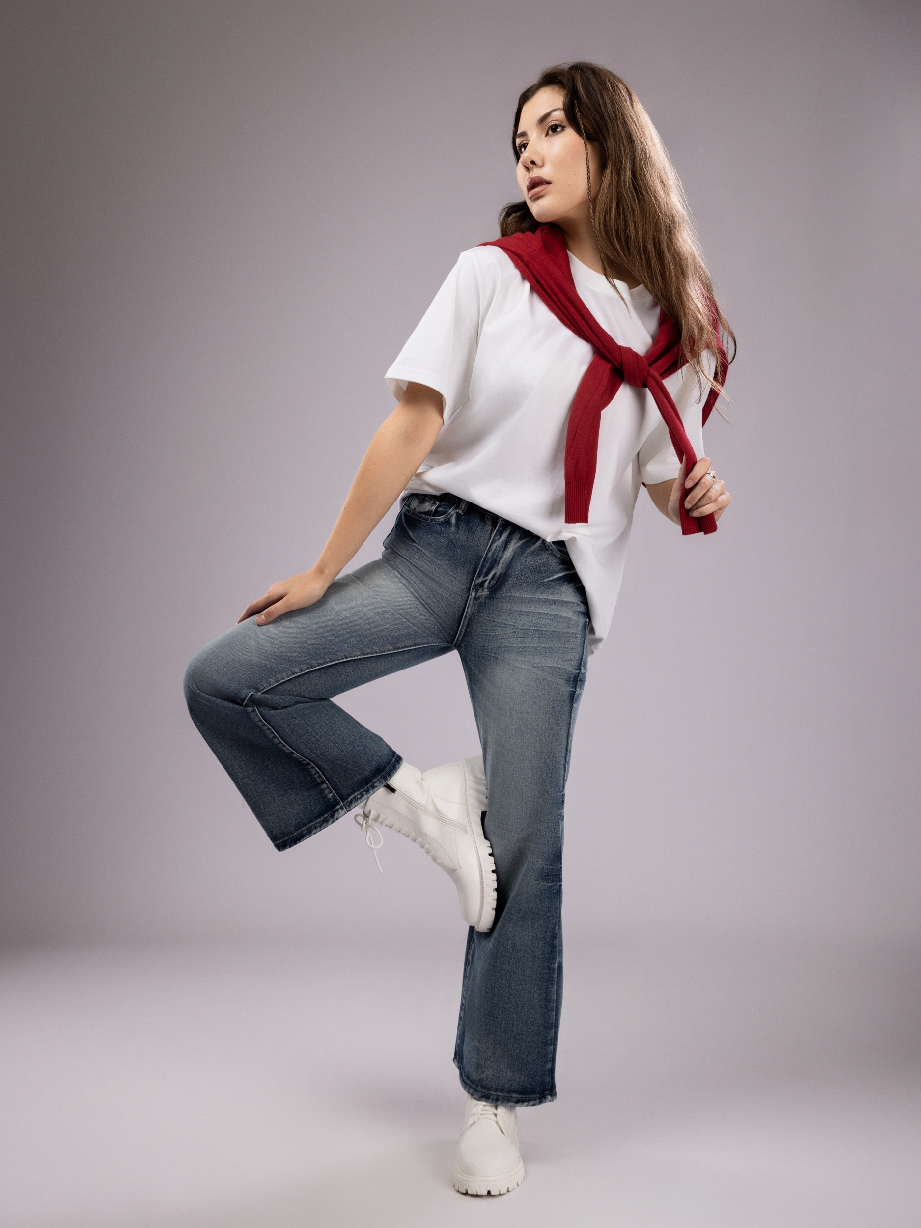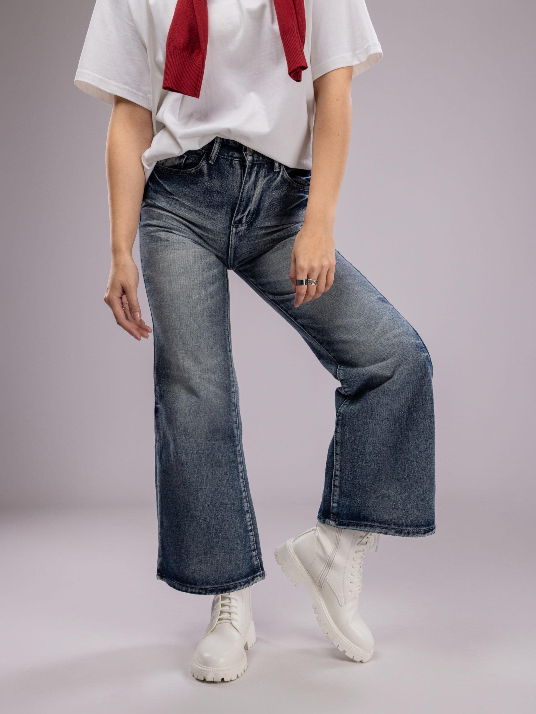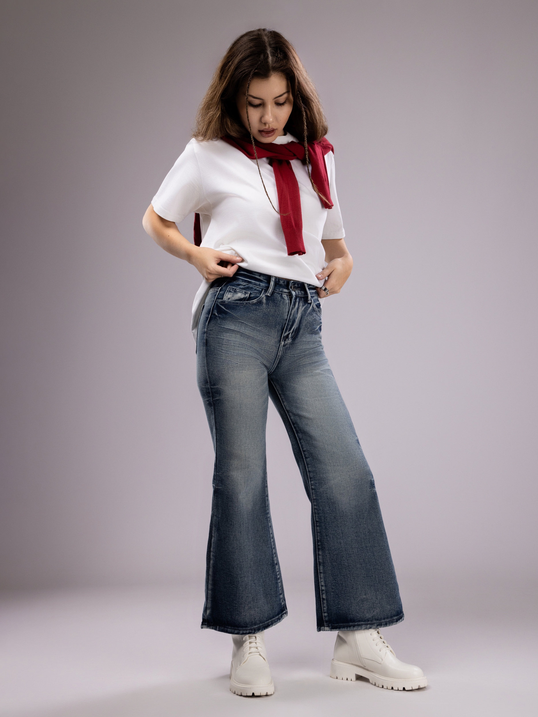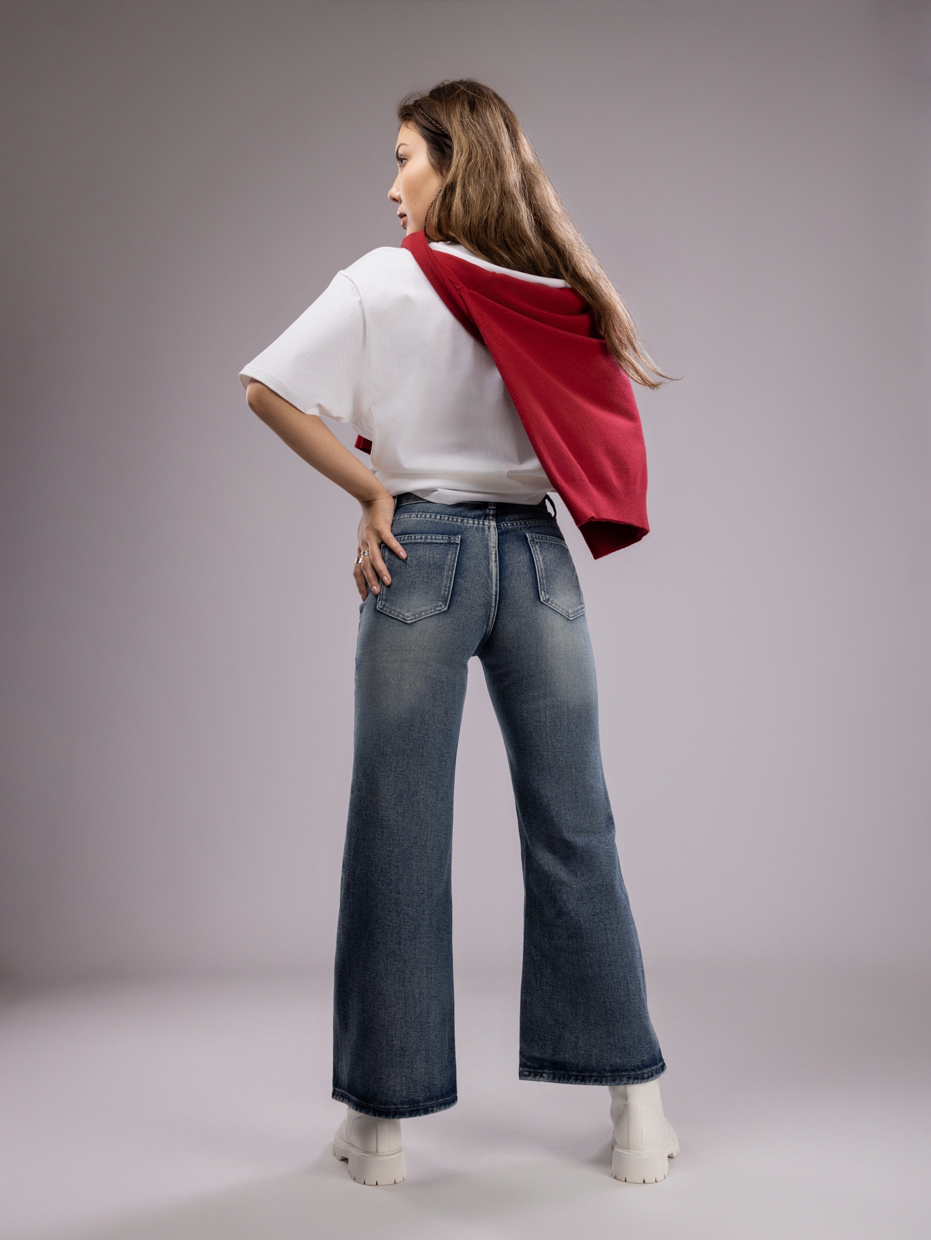 Женские брюки отличаются широкими штанинами, что не только визуально удлиняет ноги, делая силуэт более стройным и элегантным, но и добавляет образу нотки ретро-стиля с современным акцентом. Джинсы женские клеш сочетаются с разнообразной обувью — от спортивных кроссовок и сандалий до классических ботильонов и каблуков, открывая широкие возможности для воплощения как повседневных, так и стильных, более изысканных луков.
