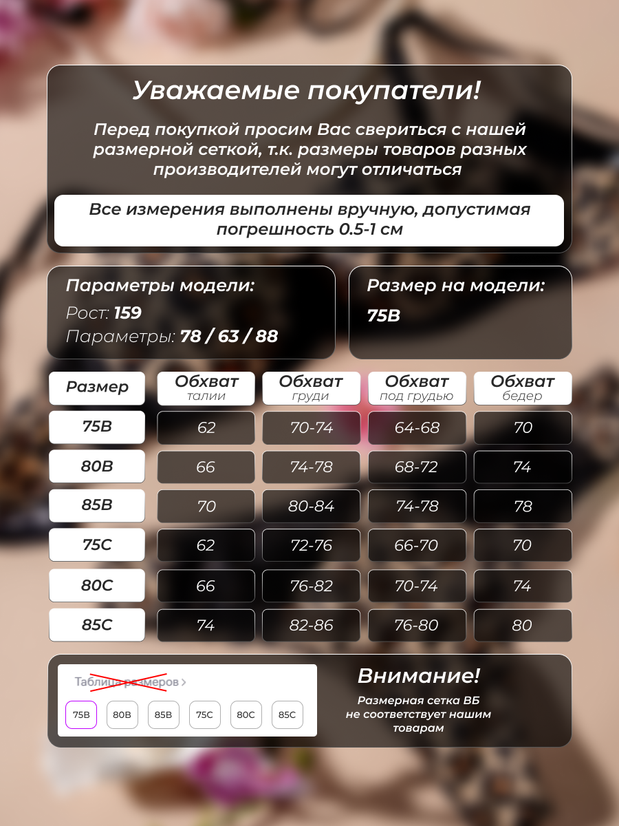 Цветовая палитра сочетает черный оттенок, леопардовые вкрапления и атласные мотивы. Такой подбор ткани и расцветок специально выбран, чтобы белье смотрелось выигрышно под любой женской одеждой, подчеркивая индивидуальный стиль девушки. Благодаря гладкой поверхности атласного материала комплект придает ощущение свежести и нежности при соприкосновении с кожей, обеспечивая максимальный комфорт на протяжении всего дня.
