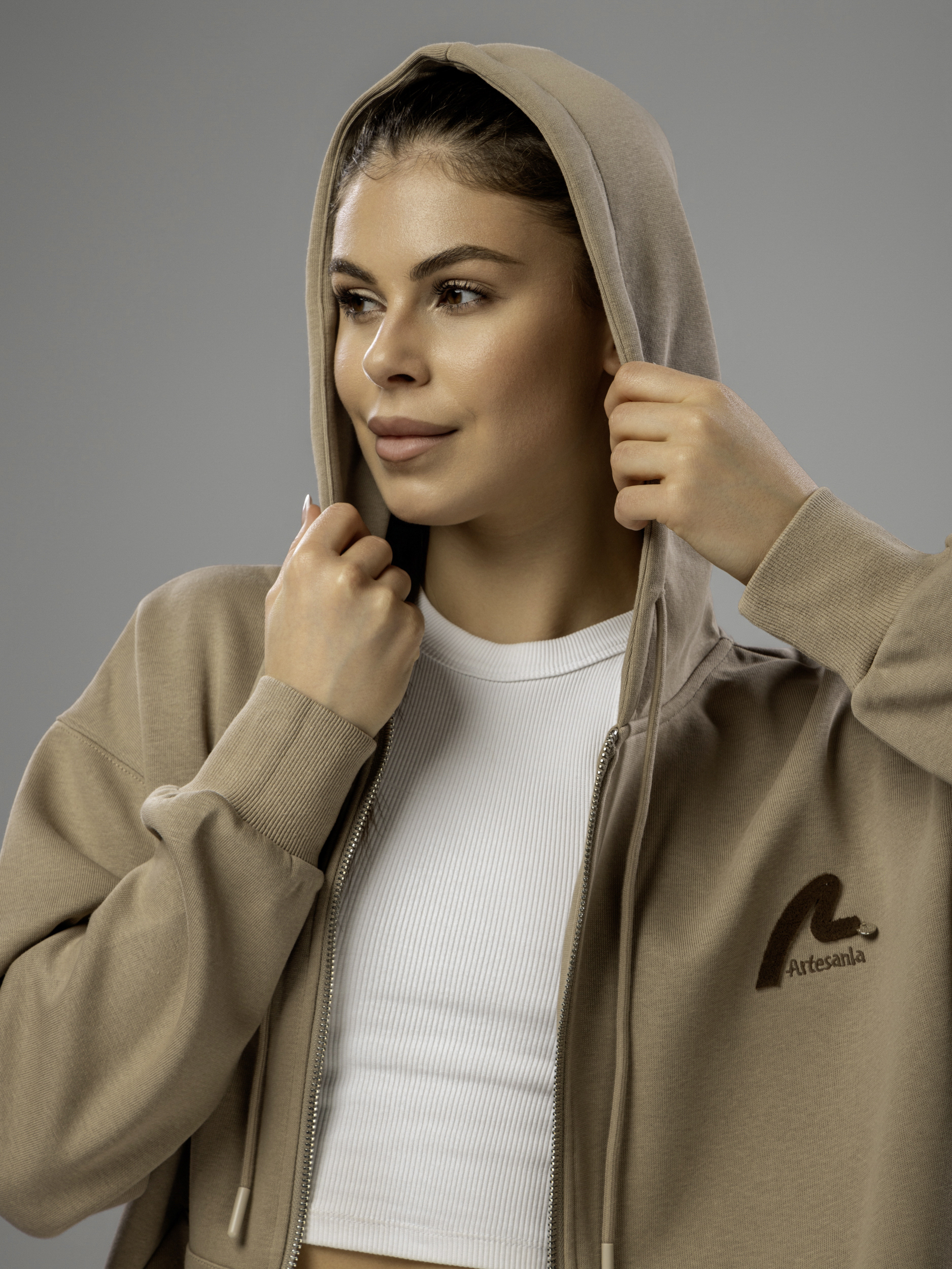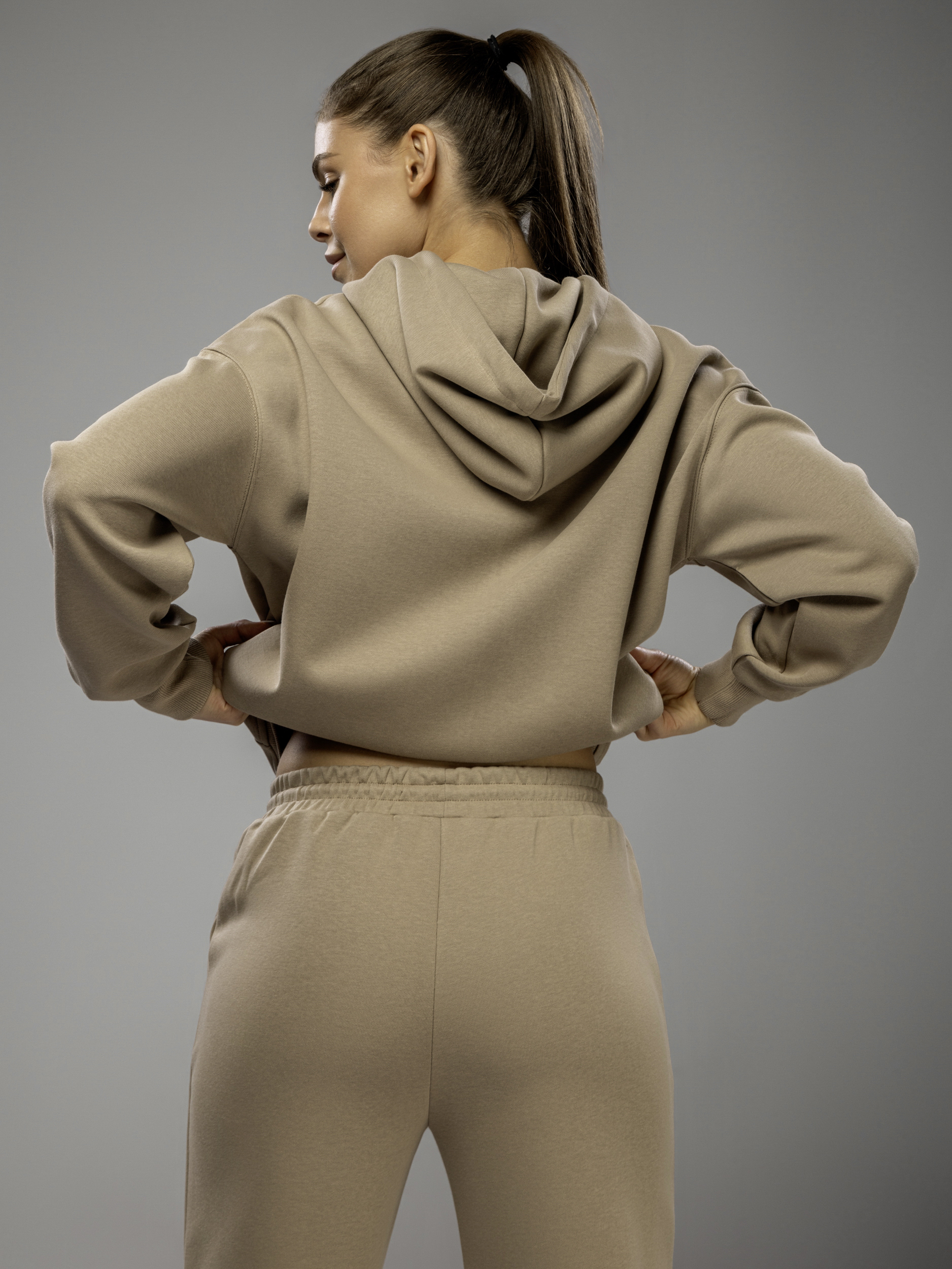 Женский спортивный костюм состоит из кофты на молнии с капюшоном и брюк джоггеров. Верх изделия — толстовка с длинным рукавом, регулируемыми завязками на капюшоне и прорезными карманами кенгуру, что удобно для спорта или повседневной носки. Летняя одежда женская выполнена из хлопка и полиэстера, материал легкий и приятный к телу, хорошо подходит для летнего и демисезонного использования, а также в качестве базового варианта для весенних дней.