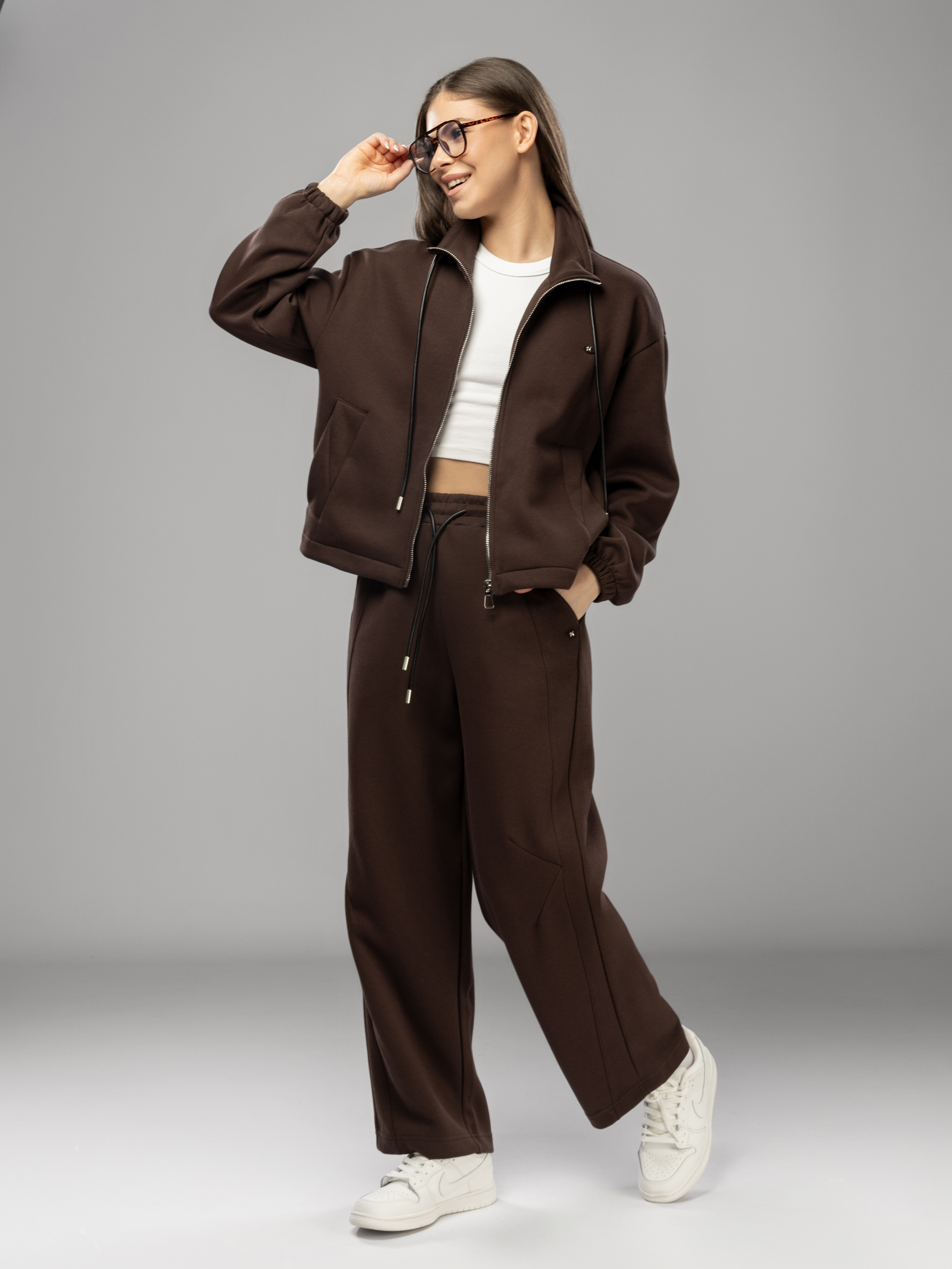 Толстовка украшена аккуратной нашивкой, что придает женскому комплекту стильный и современный вид. Рукава дополнены эластичными манжетами, которые обеспечивают комфортную посадку и не сковывают движений во время активного отдыха и спорта. Широкие брюки на регулируемом поясе подходят девушкам и подросткам с любым типом фигуры. Спортивный костюм женский без начеса остается легким и дышащим даже в теплое время года. Элементы декора и аккуратная отделка подчеркивают женственный силуэт, а оверсайз посадка обеспечивает свободу движений. Широкие брюки и толстовка на молнии гармонично сочетаются между собой, создавая завершенный образ. Приятная на ощупь текстура подходит для чувствительной кожи, не вызывает раздражения. Костюм повседневный с брюками рассчитан на длительное использование, не теряет форму после стирки, сохраняет насыщенность цвета.