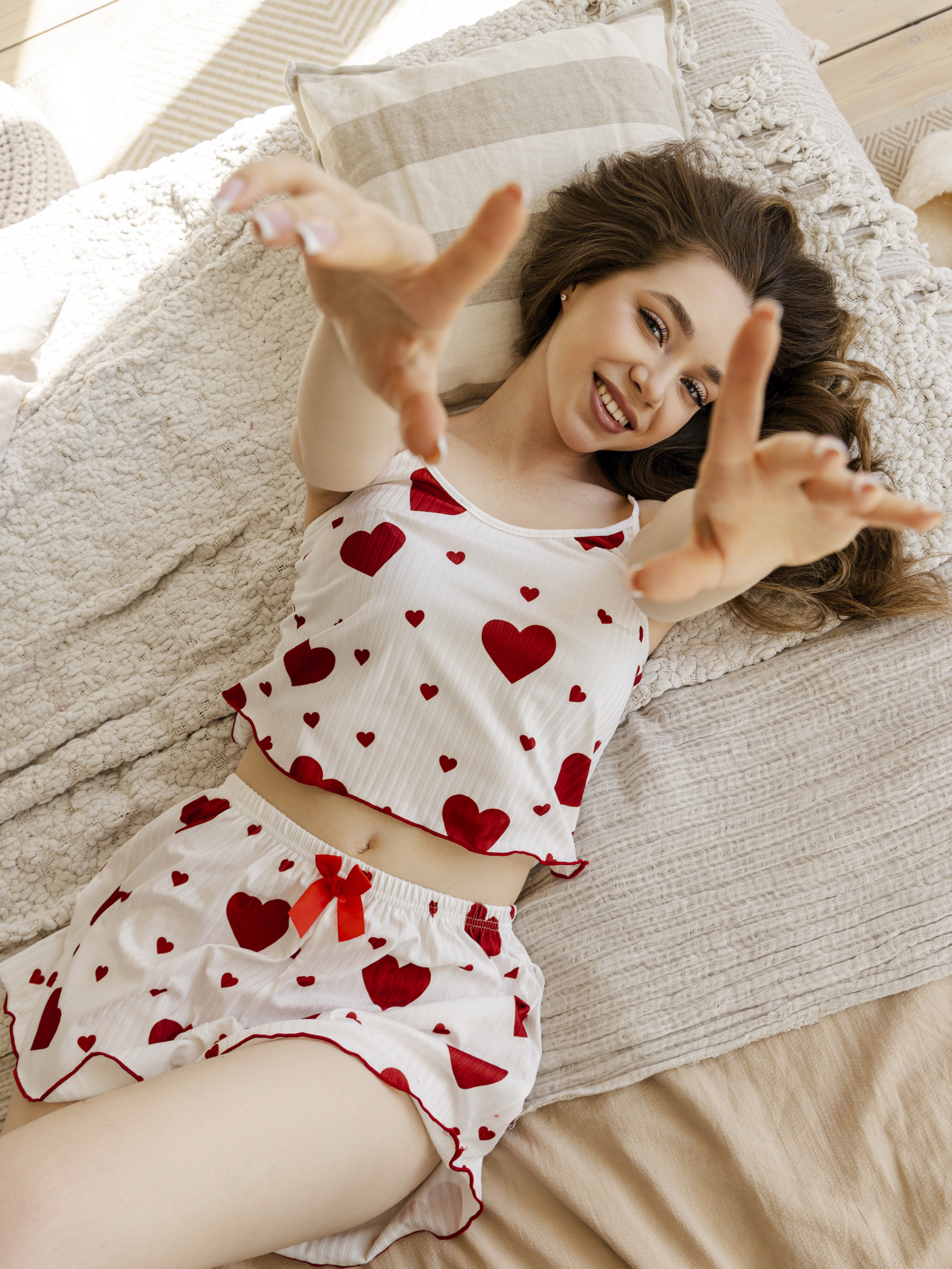 Женский домашний костюм с шортами это идеальный вариант для комфортного отдыха дома. Женская пижама с сердечками включает в себя топ и шорты. Такая пижама шорты и майка станет идеальным выбором для сна или уютного вечера дома. Топ на бретельках мягко облегает тело, а эластичный материал обеспечивает удобство. Майка украшена стильным дизайном с сердечками, что добавляет милый акцент образу. Шорты выполнены из приятной ткани с добавлением полиэстера и эластана, создавая нежное ощущение на коже. Резинка на шортах гарантирует комфорт при носке и обеспечивает удобство в движении, делая женский ночной комплект универсальным для любой женщины или девушки. Легкий материал позволяет коже дышать, что особенно важно во время сна. Женская пижама с топом подойдет как молодой девушке, так и взрослой женщине. Мягкая текстура ткани делает его отличным вариантом белья для отдыха после напряженного дня. Такая женская летняя пижама будет радовать каждую маму или дочь благодаря практичности и очаровательному дизайну. Женский топ с милыми элементами в виде сердечек прекрасно гармонирует с домашними шортами, создавая нежный образ для отдыха в кругу семьи или уединения в собственном доме. Топ и шорты подходит как для ночного сна, так и для повседневного ношения дома. Эта женская пижама с шортами и майкой отличается мягкостью материала, легкостью кроя и стильным оформлением. Эластичный топ дополнен регулируемыми бретельками, что позволяет настроить его по фигуре. Такой комплект для сна станет отличным выбором одежды для тех девушек или женщин, кто ценит комфорт и стиль даже дома. В таком наборе каждая женщина почувствует себя уютно и уверенно.